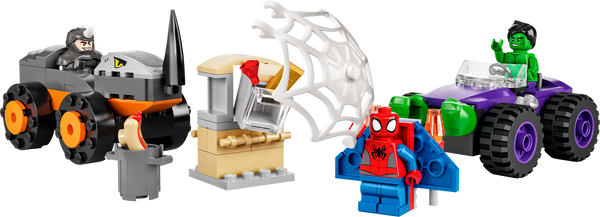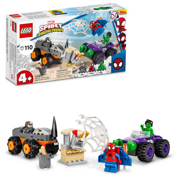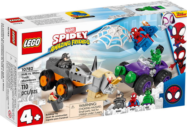 The LEGO® Marvel Spidey And His Amazing Friends Hulk vs. Rhino Truck Showdown (10782) building toy puts Super Heroes aged 4 and up in the driving seat as they race to save the day. Kids recreate scenes inspired by the popular Disney+ TV series as they help Spidey and the Hulk thwart Rhino’s bank heist. Kids will love the battle wagons in this collectible, buildable toy set. Each monster vehicle features cool details – Rhino’s truck has a ramming horn, while Hulk’s has a pair of massive fists ready for smashing combat. Make building a breeze 4+ playsets get kids building fast. This one comes with 2 truck bases, so kids get to the play quickly. They don’t even have to complete the whole build before the play begins because each bag of bricks contains a model and a character. Simple picture guides make building easy, even for kids who aren’t yet reading. Grown-ups can also join in the fun, passing on their construction know-how to help little Spider-Man fans become master builders.