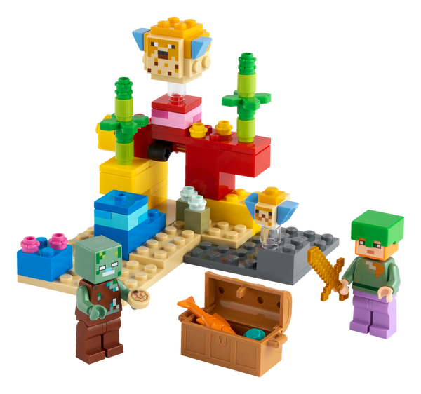 Join Alex beneath the Minecraft™ ocean as she searches the colorful coral reef for hidden treasure. Say ‘Hi’ to the 2 friendly puffer fish. Turn the big yellow rock to make the treasure chest appear. What’s inside? Just a fish and… a pearl! Watch out! A drowned is heading your way! Will Alex defeat the zombie and keep the treasure? Only you can decide.