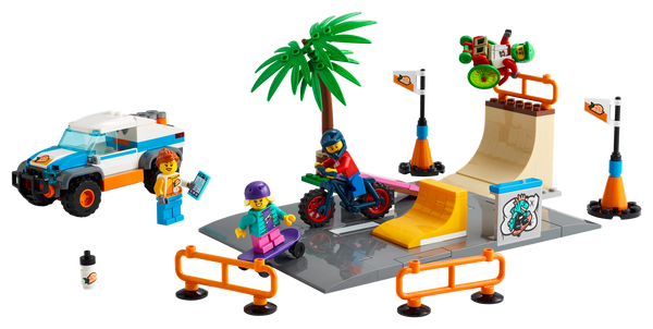 LEGO® City is buzzing with excitement as skaters of all ages and disciplines show off their skills. The road is cordoned off for the skating event and a Vita Rush promoter is handing out free cans of soda from the pickup. Check out the wheelchair athlete performing high-flying tricks on the quarter pipe, while a BMX rider demonstrates amazing balance on the seesaw ramp… so awesome!